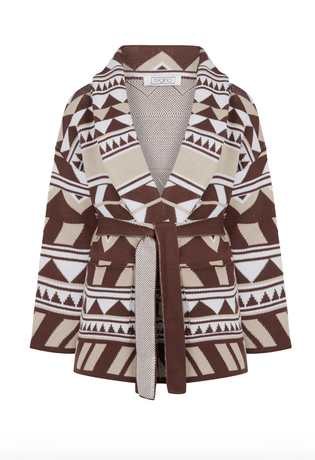 Fringed & belted jacquard cardigan.