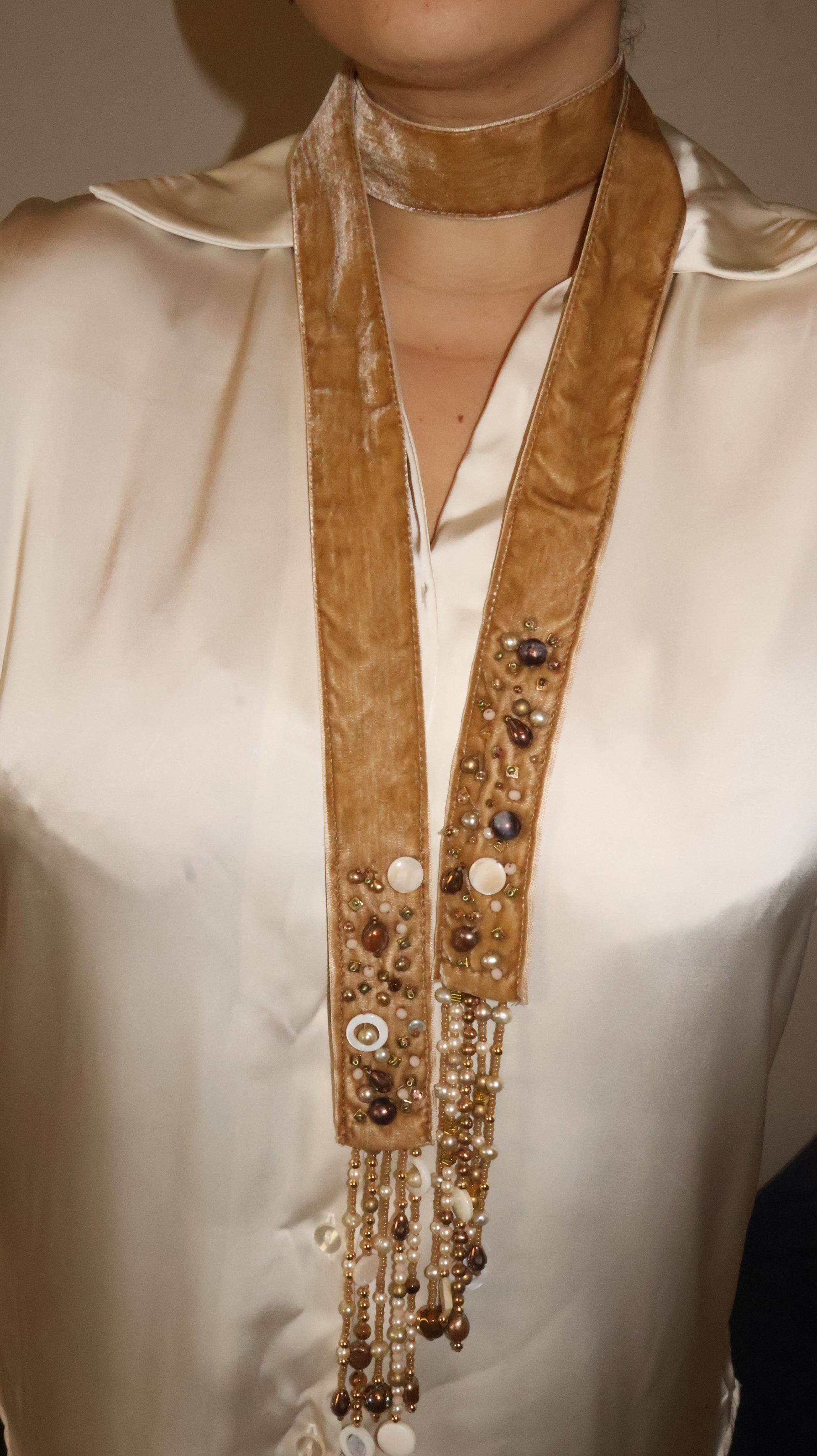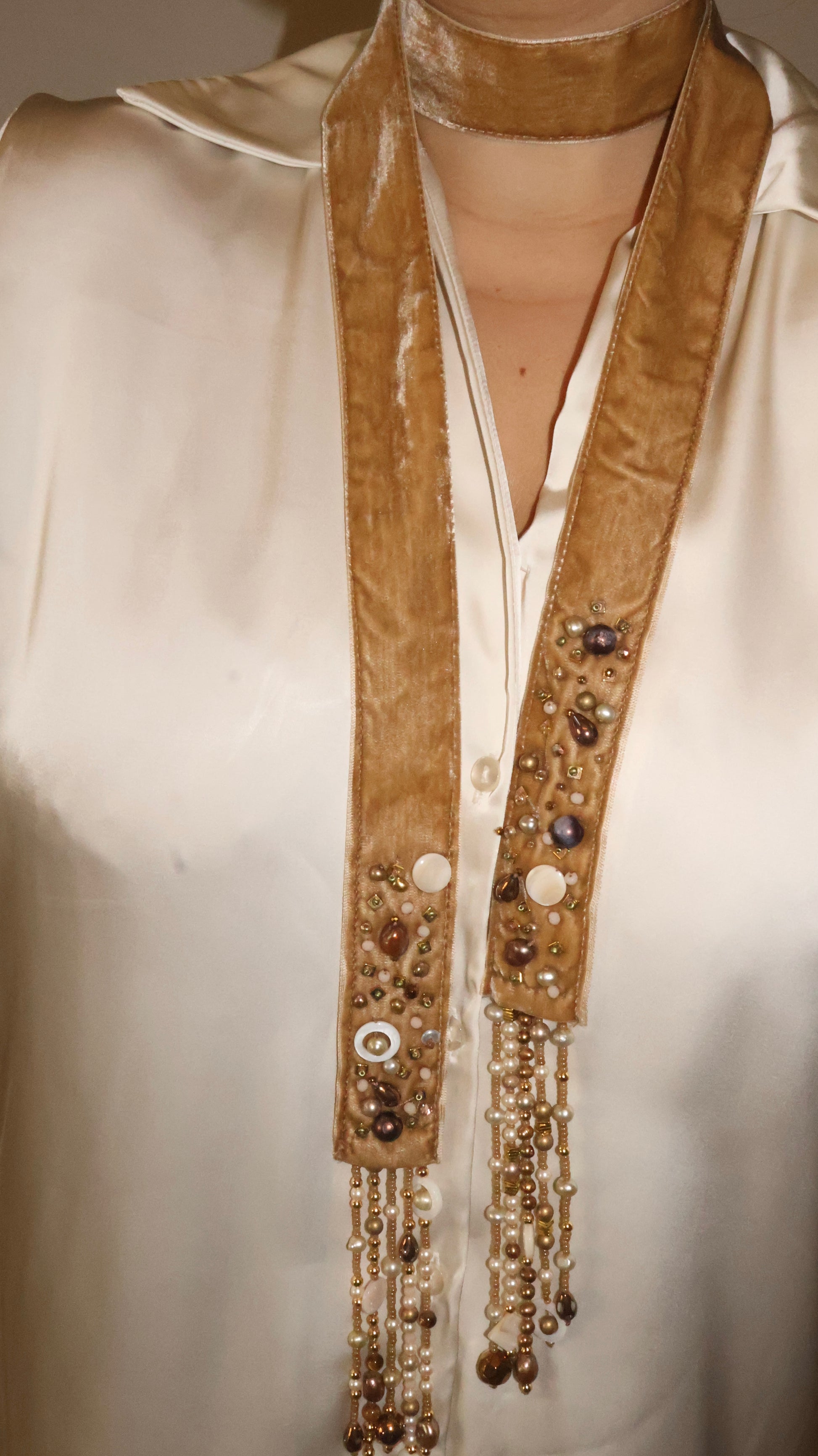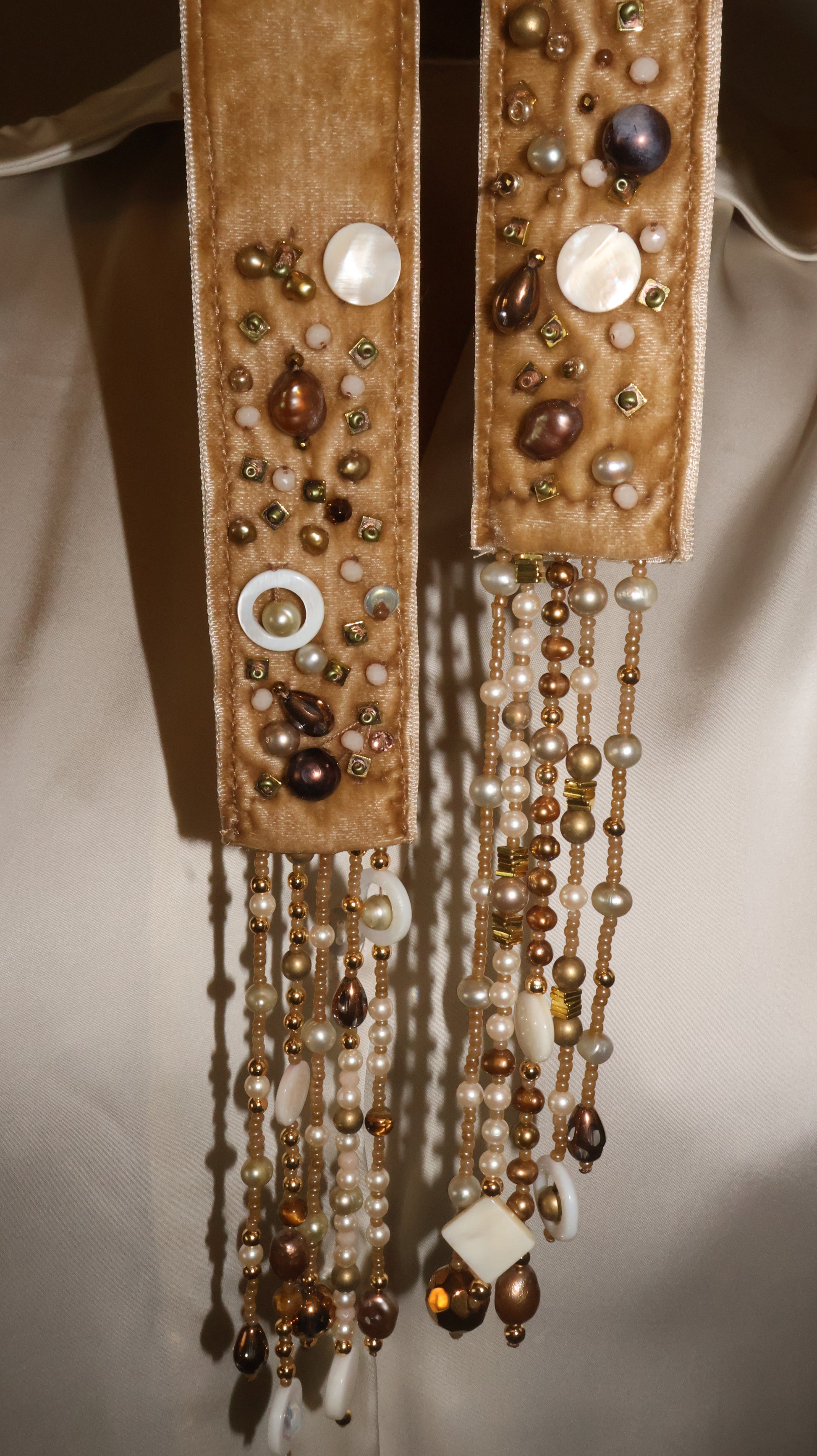 Beaded with crystals and semi-precious stones. Scarf is velvet.