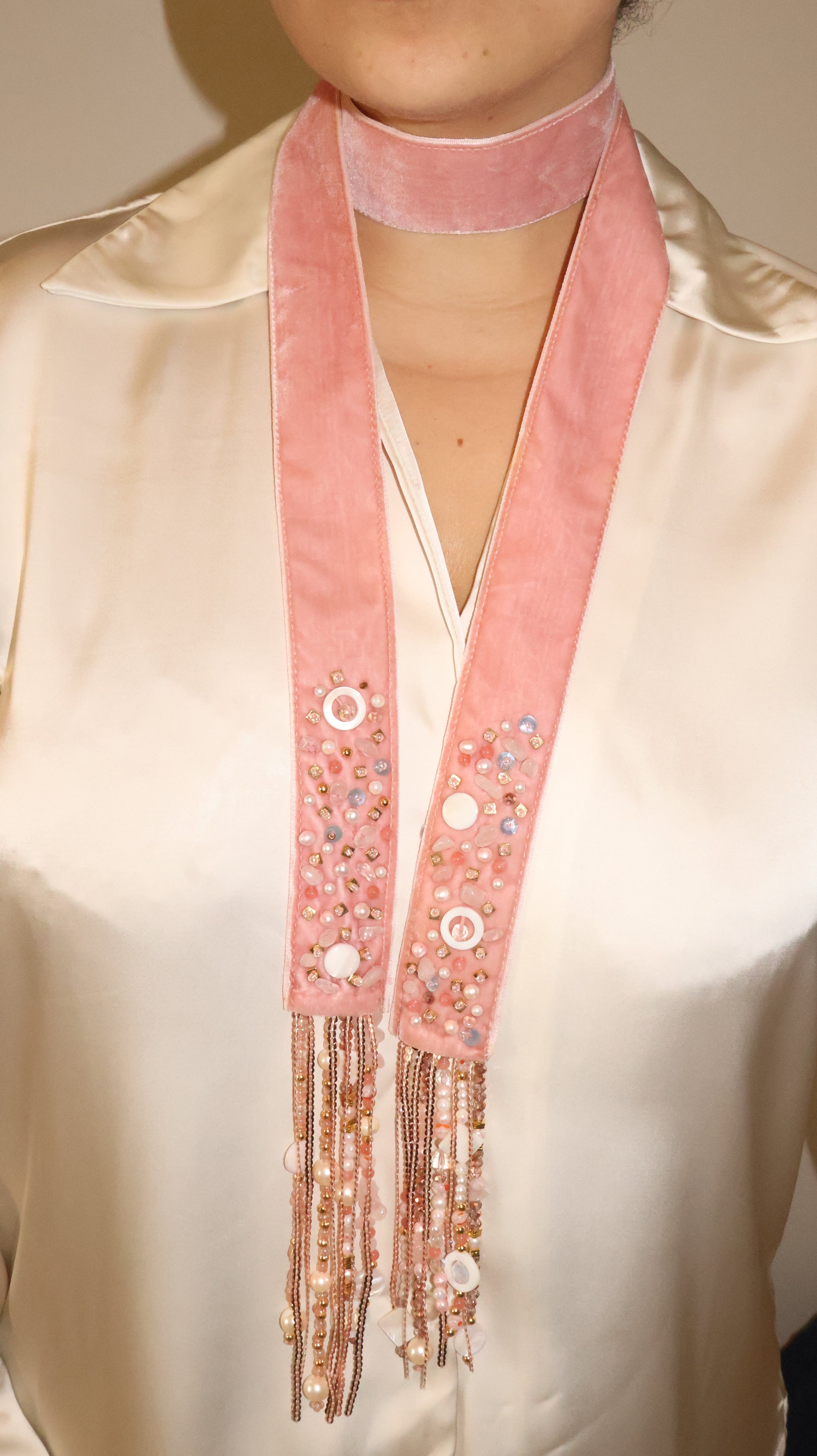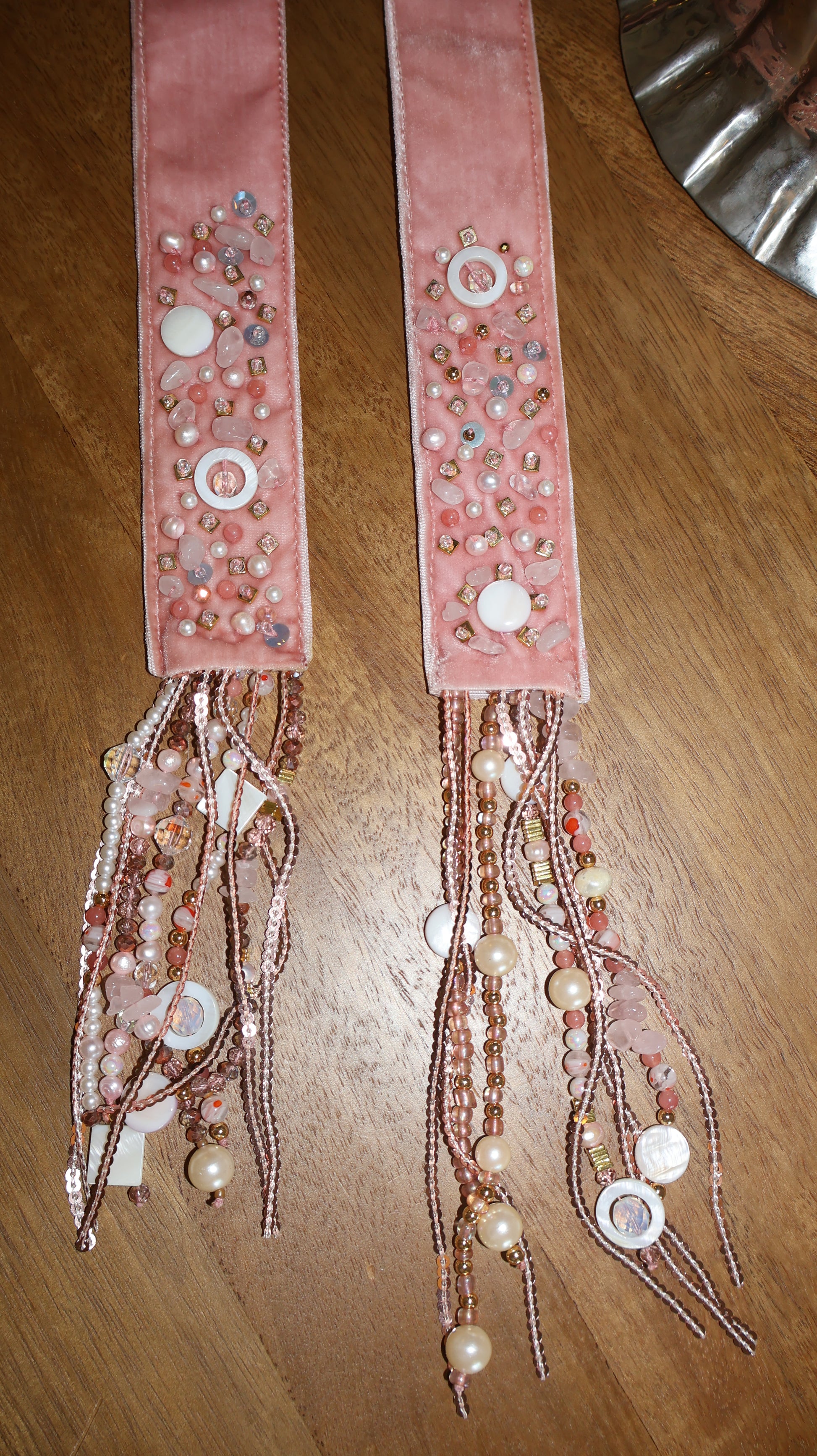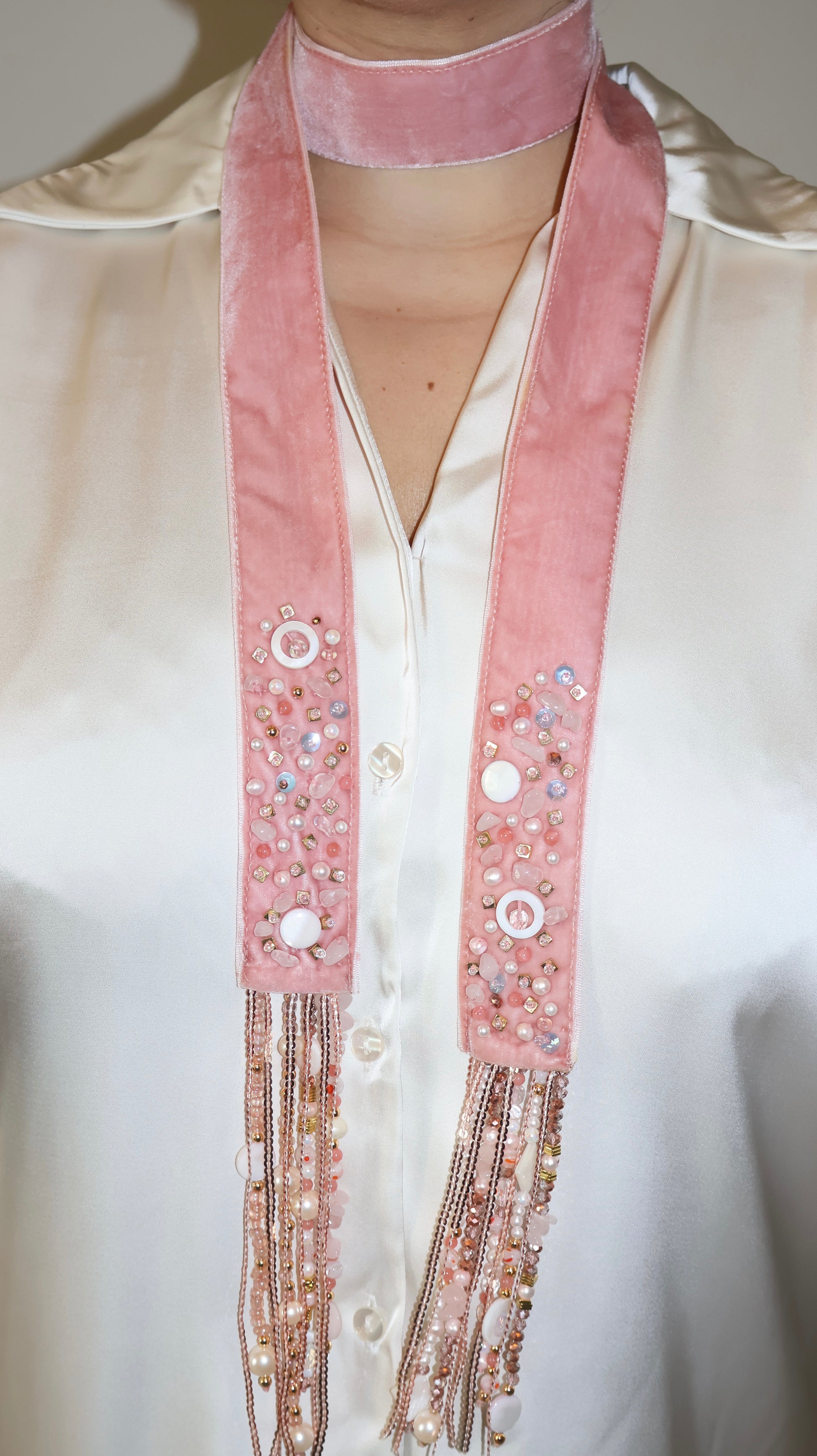 Beaded with crystals and semi-precious stones. Scarf is velvet.